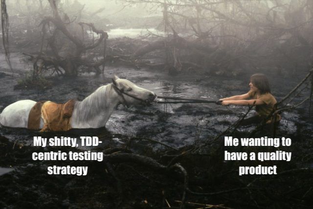 That's not to say that TDD can't be part of a larger testing strategy. But remember, you're using tests to drive design. As the design of the code shifts and evolves it may obviate some of your earlier design-driving tests, and you need to be free to delete them. You won't be free if your testing strategy relies too heavily on your design-driving tests, and those old tests will drag you down like the Sadness dragged down Artax.