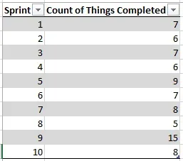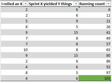 - Whatever number comes up (x) is the sprint we’re going to look at. Check the chart above and write down the count of things completed for sprint x