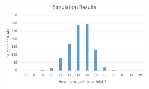 It looks like 15 sprints is a pretty reasonable bet, but really this is a conversation you want to have with your stakeholders. How much risk are they willing to take on? For example, if they wanted to be aggressive they may want to target 13 sprints, although I would make sure they understood there’s only a 50% chance we’d make it, according to the data.
